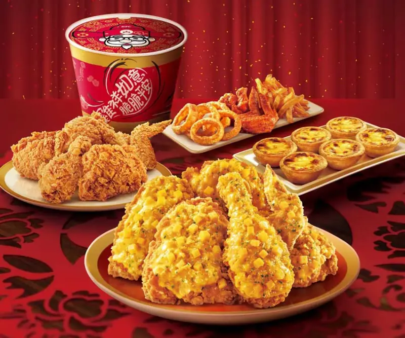 ▲「金雞鴻運餐」內含金宴起司雞、咔啦脆雞、紐奧良烤雞翅、香酥脆薯、洋蔥圈及一盒原味蛋撻,種類多樣澎湃,是與家人及好友們一同享用的豐盛饗宴首選。