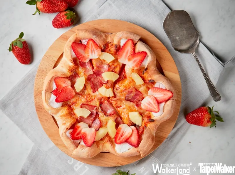 市面上比薩外圈捲心多半使用起士或火腿等「鹹」口味作為芝心,故特地顛覆一般構想,除了原有的起司捲心、地瓜捲心之外,更將比薩外圈改用「甜」的草莓大福捲心,以日式麻糬包入現點現作的草莓果粒卡士達醬作為捲心餡料,經過高溫烘烤後便會出現融化爆漿的可口畫面,搭配濃郁起司,意外豪無違和感,反而增添了比薩清爽的好滋味。