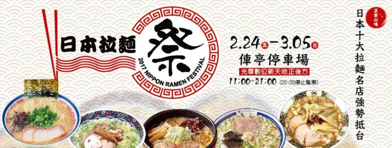 風靡日本的「日本拉麵祭」將在2017/2/24於台北舉辦為期十天的限時限量、現點現煮的拉麵祭活動。本次活動總共邀請十家來自東京、北海道、福岡、神奈川的人氣拉麵店職人,將拉麵湯頭原汁原味空運來台,重現最道地的日本國民美味。