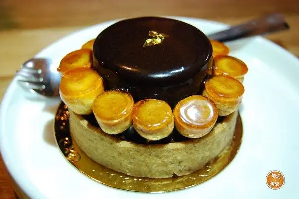 外面用焦糖小圓餅包成一個圈,上面還加上金箔,有一種金璧輝煌的感覺,看起來相當大方。裡面的巧克力濃度高,可以吃得出它細緻的感覺,而且甜度適中,從內外圈吃到不同口感,是店裡的招牌之一。<全文介紹及店家資訊>