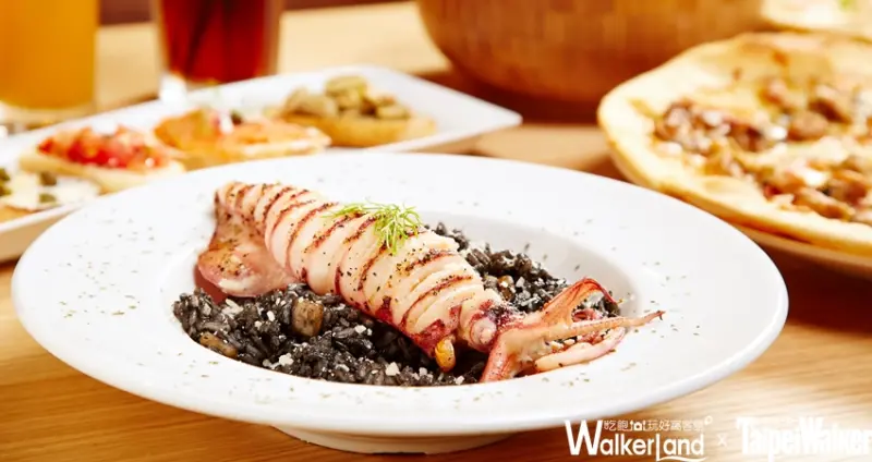 墨魚花枝燉飯(前)、台灣三杯雞風味披薩(右)/ 店內推出多款新燉飯料理,墨魚花枝燉飯以花枝、透抽和墨魚汁料理而成,鮮味十足;三杯雞台灣風味披薩香氣迷人,入口瞬間讓人會心一笑,濃濃台式風味親切感破表!義式綜合香烤麵包、燻鴨金柑野菜沙拉也是佐餐首選。 ![]()