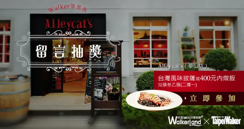 就是愛吃台灣味!隱身於華山角落的義式料理「Alleycat's」,以窯烤薄脆披薩抓住老饕的胃蕾,近期以全新裝潢重新亮相,更推出超具有台味的披薩,如大腸包小腸、三杯雞等,現在WalkerLand窩客島和TaipeiWalker要帶你去品嚐最具台味的披薩!只要在本篇情報下「留言+分享」,就有機會獲得免費試食券!![]()