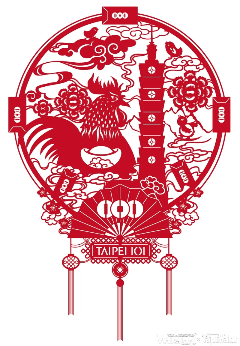 台北101新年檔期活動十足有「藝」思!為慶賀雞年新春新氣象,台北101自1月19日(四)起至2月14日(二),歡喜舉辦《雞好運、抽紅包》檔期活動,特別邀請新瑞剪紙藝術家陳彥廷操刀設計新春視覺概念,將台北101、神采奕奕大公雞、金元寶、大牡丹、祥雲瑞氣,以及象徵大智大勇的中國扇等元素巧妙結合,並以中國傳統剪紙藝術形式呈現,精彩描寫出「雞鳴曉旦、大吉大利」喜氣意象。