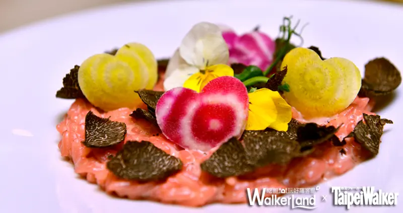 「L’origine by La Credenza 歐傑洛義式餐廳情」人節套餐每位NT$2,480+10%,米其林主廚充滿烹調靈魂的料理強項−限量粉紅色燉飯,絕對是在這專屬情人的節日中,最令人期待的重頭戲。
