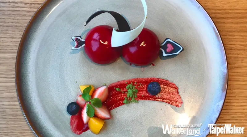 本次套餐更特別為情人設計打造的”心之所向白巧克力慕斯”,白巧克力慕斯軟綿的口感,淋上鮮豔的草莓醬,加上黑巧克力製成愛神的箭穿插在其中,讓情人們品嚐起來心意更相通,外圍以各式水果裝飾而成的繽紛大愛心,更是戀人間心之所向的象徵。![]()