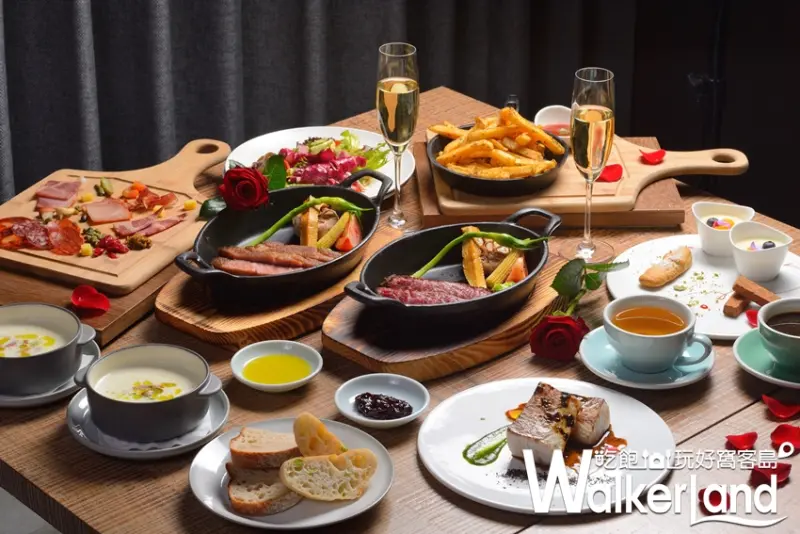 《RÒU by T-HAM》情人節經典西式雙人套餐,頂級松露、煙燻火腿的香氣,流洩在木質調的溫潤空間,豐盛的菜單設計提供餐前酒、前菜、湯品、配菜、主菜、餐後甜點及飲品,雙人價4,680元。