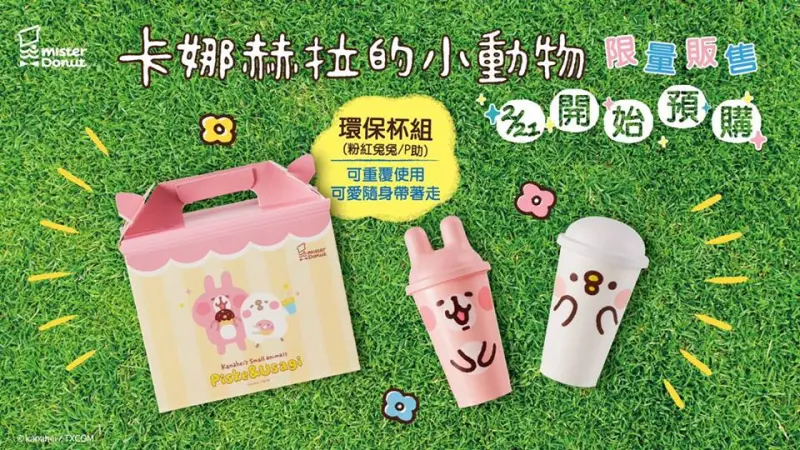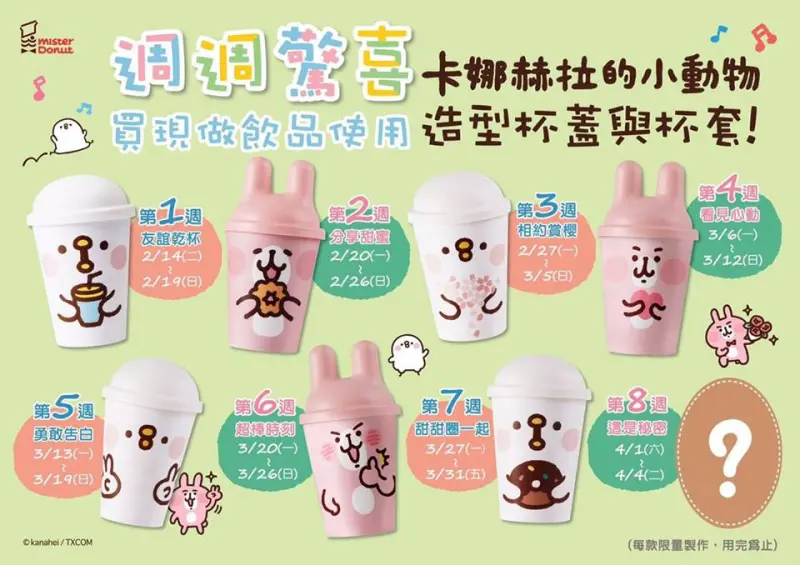 Mister Donut曾在十二週年推出超可愛的麗莎&卡斯柏造型造型杯蓋跟造型杯套,今年情人節除了推出期間限定的造型的造型杯蓋跟造型杯套更在2/21加碼推出預購卡娜赫拉的小動物環保杯組,內含粉紅兔兔杯1個、P助杯1個、彩盒1個。