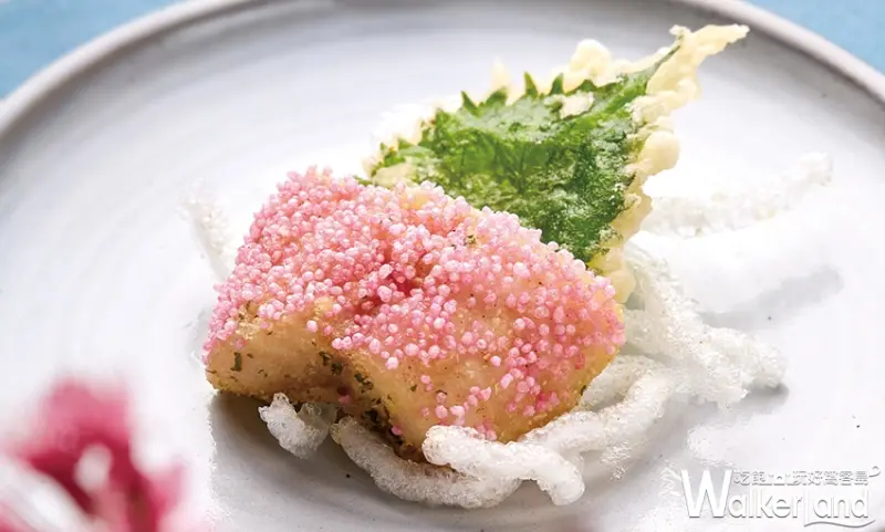 而最讓饕客們眼睛為之一亮的就是創意揚物「馬頭魚米菓揚」,肉質細緻軟滑的馬頭魚常以香煎方式呈現,主廚發揮巧思,將其裹上紅色米菓入鍋油炸,粉紅色澤如盛綻櫻花,搭配炸酥的紫蘇葉與冬粉層層疊砌而起,躍出盤上的輕盈舞姿,正如賞花時略帶詩意的美學意象![]()