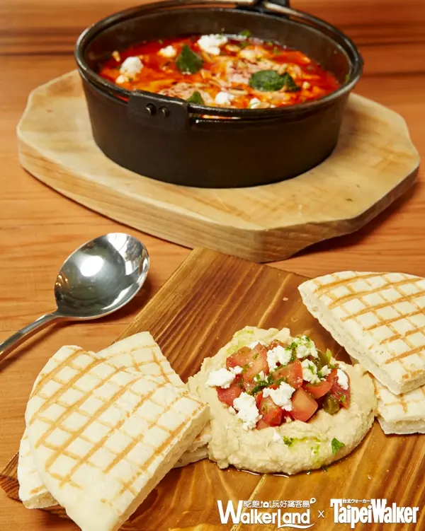 好蔬夏卡蘇卡350元/夏卡蘇卡是一道番茄水波蛋料理,中東區域的代表性美食,可先將鷹嘴豆泥、番茄酸豆沙拉等餡料放進皮塔麵包裡,再加入鐵鍋中的料理醬汁一起入口,滋味滿分。
