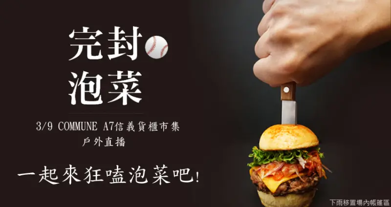 歷史的宿敵在洪荒那頭怒吼,身為天敵般存在的韓國隊,我們這次可以狠狠地狂嗑泡菜嗎?台灣球迷的心聲,「COMMUNE A7信義貨櫃市集」都聽到了!2017世界棒球經典賽」,其中最受球迷矚目的台灣、韓國之戰於3月9日下午17時30分進行。基於球迷都「真的好想贏韓國」,COMMUNE A7決定於當日架設起大型投影布幕,邀請台灣球迷一起在戶外觀看熱血球賽轉播;而人氣名店Selfish Burger 喀漢堡,也推出3/9復仇之戰當日限定的「完封泡菜」小漢堡,讓熱血台灣球迷一起在街頭集氣吶喊、喀泡菜,暢飲在地精釀啤酒,為台灣的棒球隊加油吧。![]()