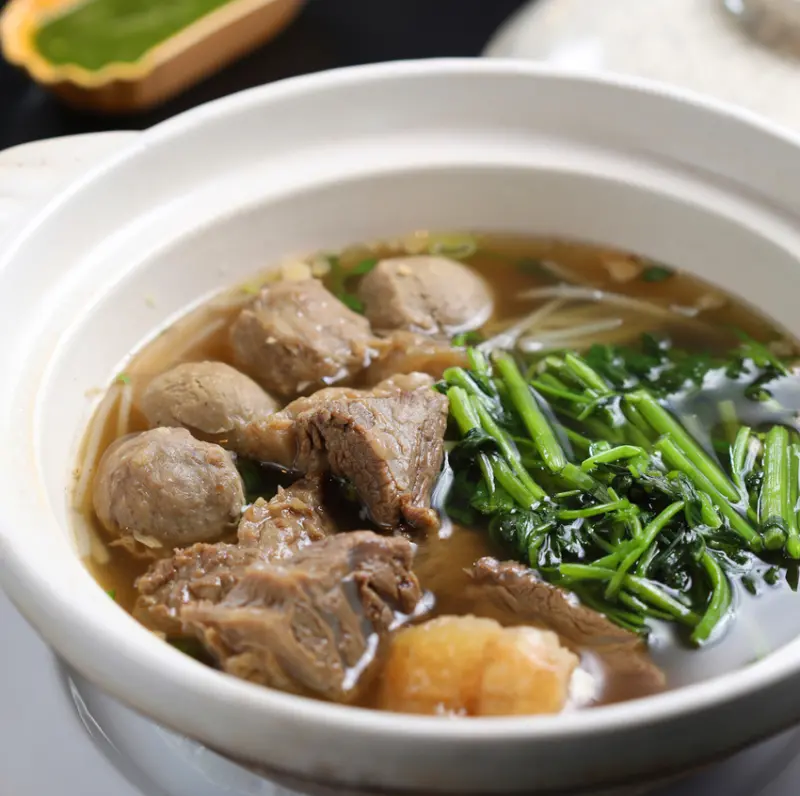 Thai & Thai 的董事長林命群,本身即為泰國華僑。而每次林先生到Thai&Thai用餐時必點湯品,就是這一道了。以牛骨、黑胡椒、芫荽根、洋蔥、八角、肉桂熬製湯底一日,再加入牛小排、牛腱肉、牛筋、牛肉丸、空心菜、豆芽菜同煮,外觀雖似台灣的清燉牛肉湯,但清澈爽口湯頭飄散出的特有香氣又更勝一籌,牛筋讓清湯富有膠質。豐富的配料,讓您一次盡嚐每日手工製作牛肉丸的彈牙、軟嫩略帶口感的牛腱肉、Q軟化口的牛筋,與爽脆甘美的蔬菜,鮮甜滋味口中縈繞不絕。建議消費者品嘗時,先飲用原味湯汁,享受其清甜與潮州菜系風味;隨後再加入專屬的泰式辣椒醬,其湯頭會展現出另一種泰式料理風情。