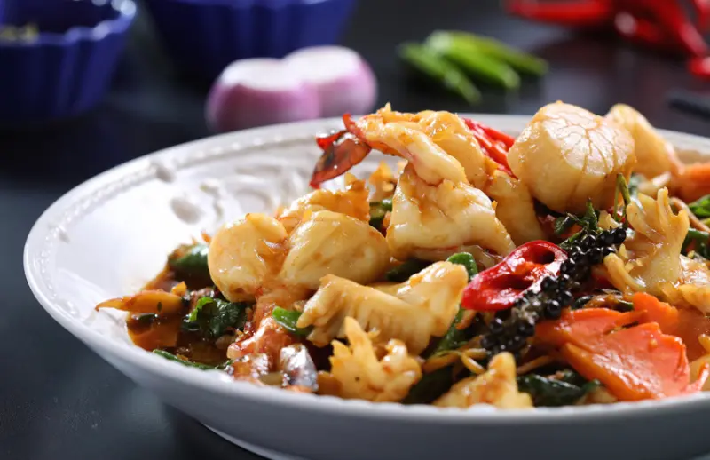 選用明蝦、生食等級干貝、透抽,與泰國進口的新鮮綠花珍珠胡椒,帶有麻香與辣味,與洋蔥、紅辣椒、甲猜、檸檬葉、打拋葉等辛香料,以泰式黑抽快火拌炒,再加入長豆、玉米筍、紅蘿蔔等蔬菜增添色彩及均衡口感。甲猜的味道似薑、卻又比薑柔和,泰式黑抽帶甘甜不死鹹,海鮮口感彈牙鮮美,整體香辣夠味,屬於口味較重的泰國東北菜式。
