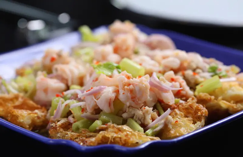將雞蛋高溫半煎半炸,搭配汆燙至恰到好處熟度的蝦仁及豬肉末,拌入新鮮芹菜、香茅、紅蔥頭絲、檸檬汁、魚露及椰糖,酸香爽口混合濃郁蛋香,讓人一口接一口欲罷不能。此道原為泰式家常菜,一般只有雞蛋、蔬菜與酸辣醬汁涼拌,Thai & Thai加入豬絞肉與鮮蝦提升豐富度與鮮香層次,十分開胃。