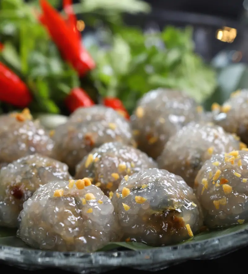 此道為泰國傳統點心Saku,是許多外地泰國人最懷念的家鄉味,亦是林董事長宴請友人時經常請廚師做的菜餚。以西谷米製成外皮,包裹肉末、花生,調和蒜、椰子糖、紅蔥頭、甜菜脯之內餡,小巧渾圓,蒸過後外皮呈現半透明,擺放盤中猶如灑落的圓珠。入口外皮軟糯,內餡鹹香微甜。搭配紅辣椒、香菜一起享用,口中多了香辣層次,風味更加豐富。