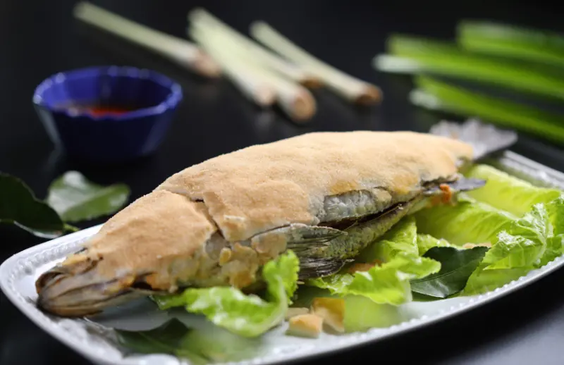 取新鮮鱸魚,魚腹中塞入香茅、七葉蘭、檸檬葉,以粗海鹽包裹後炭烤,肉質鮮甜細緻,淡雅鹹鮮中飄散出南洋香料特有的馥郁芬芳,搭配主廚特製香辣海鮮醬,將鮮魚風味提升至另一層次。