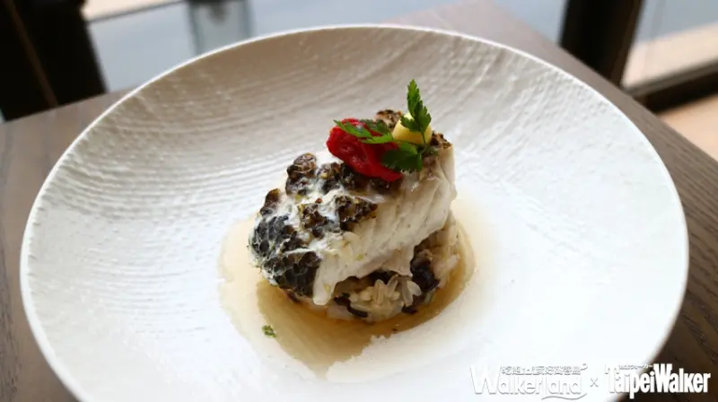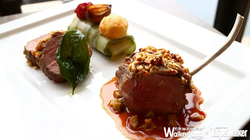 而主菜之一的「紐西蘭法式羊排 燴蔬菜 黑蒜頭 酥炸玉米糕 尼斯橄欖醬汁」,羊排在前一天先透過低溫熟成的方式讓肉質最軟嫩的口感完全保留下來。接著裹上綜合堅果,烤至大約七分熟的熟度,而堅果碎粒增添了口感變化,底層的雞肉原汁及微酸的尼斯橄欖醬汁,引出羊肉的鮮甜卻沒有惱人的羊騷味。![]()