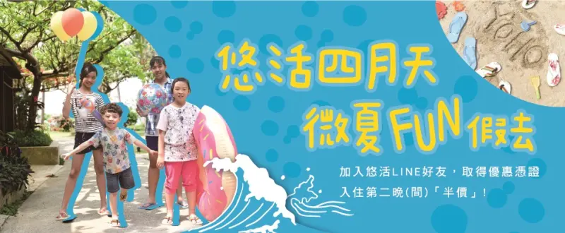 在墾丁西岸萬里桐,YOHO就位處擁抱一片碧海藍天及傲人的珊瑚礁海域及潮間帶,讓來訪旅人的每一步腳印都伴隨著美麗的回憶!YOHO設有兒童旅館,小朋友最喜歡的34個主題故事主題房間與人物通通在YOHO!也設有單車旅館,提供愛好運動的人們,提供最佳的停留!悠活四月天,現在只要加入悠活 LINE 好友、取得優惠憑證,並透過悠活官網訂購住房專案,入住時出示優惠憑證,即可享有入住第2晚(間)「半價」的超值優惠!入住日期需為2017/4/1~2017/4/30!