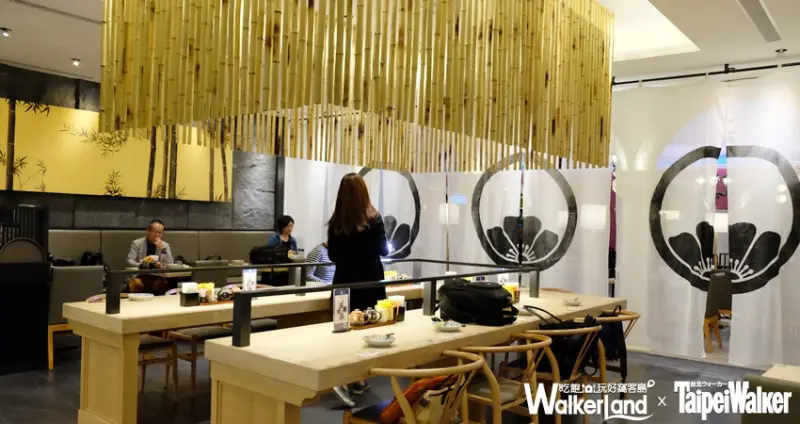 巧妙地將板橋大遠百現場既有的威尼斯元素揉和至日式和風設計裡,並以日式百年老舖為概念,由外而內穿過一道道門簾,使空間切換延伸,入內即感受到與外面截然不同的明亮感和溫暖熱鬧。![]()