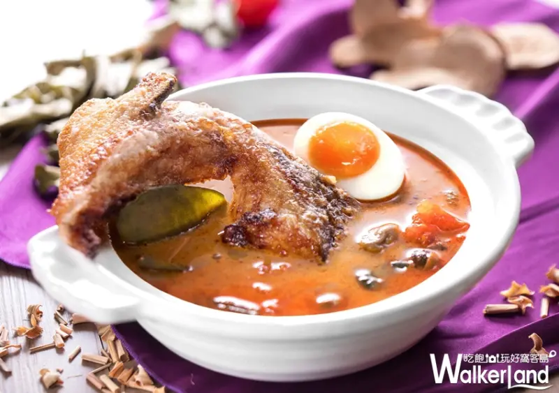 以泰式酸辣湯(Tom Yum Kung)為基底改良的「泰式酸辣鮭魚下巴鍋」,主廚選用的鮭魚下巴將其香烤後,與檸檬葉、香茅、南薑、草菇、小番茄等鮮美食材佐以泰式酸辣湯煨煮,湯頭酸辣溫潤,略帶辛香卻不嗆喉,並帶微鹹鮭魚海味,讓人不禁口水直流。