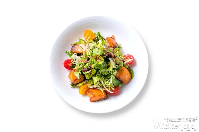 和風鮭魚味噌沙拉除了有美生菜、番茄、海帶芽等蔬果,再與香烤後的清甜鮭魚完美融合,最後淋上橄欖檸檬油醋醬,吃來清爽解膩。
