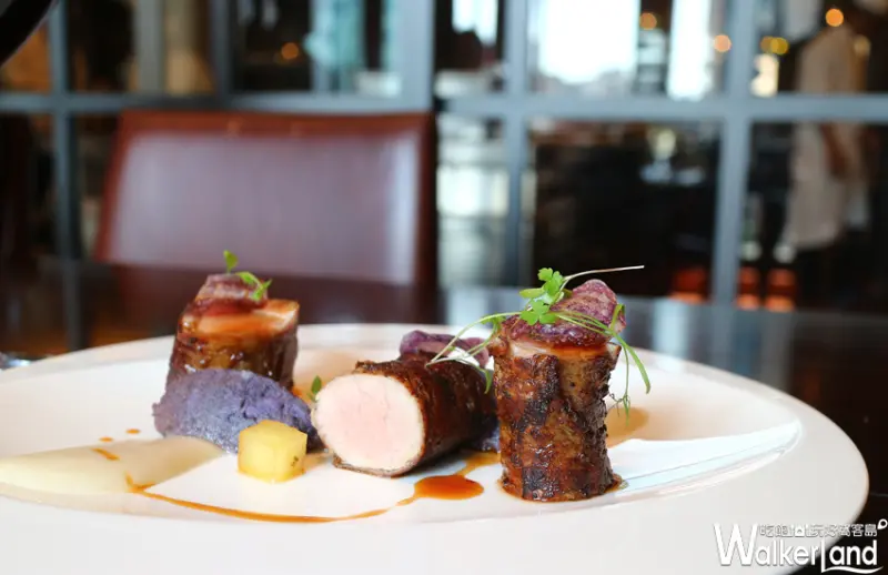 「爐烤鹿兒島豬里肌襯青蘋果」Loris主廚嚴選肉質細嫩甘甜的日本鹿兒島黑豬里脊肉,與義式白火腿薄片 (Lardo) 交疊後捲起,以低溫約68度烹調半小時,保留豬肉的柔嫩保水口感,接著再將表面以奶油和香料煎到帶有焦糖色。另著手準備盤中佐食的紫洋芋及青蘋果丁,前者是將搗碎的紫洋芋拌入帕瑪森起士、奶油和香煎過的義式白火腿末;後者則是以糖漿漬煮過後以奶油微煎,並加入些許的白酒醋。上桌品嘗前再飾以朝鲜薊製成的醬汁和紫洋芋片,不僅形色誘人,鹿兒島黑豬肉的風味與口感,是夏日最奢華的享受!