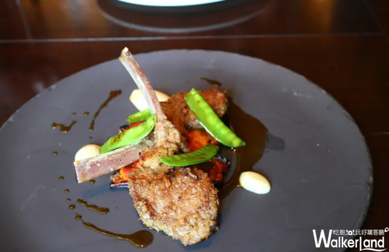 「香酥嫩煎羊肋排佐蒜泥、茄子與雪豆」鮮嫩的羊排化身為盤中的主角,作法是先將羊排均勻裹附上麵包粉,放入熱鍋中煎至外表金黃酥脆,起鍋灑上些許百里香調味。盤中佐食的烤茄子則以番茄醬汁、帕瑪森起士及莫札瑞拉起士拌炒過,上桌前在灑上蒜泥醬汁並以鮮嫩的豌豆點綴,道地的義大利風味,絕對是饕客必點菜色。![]()