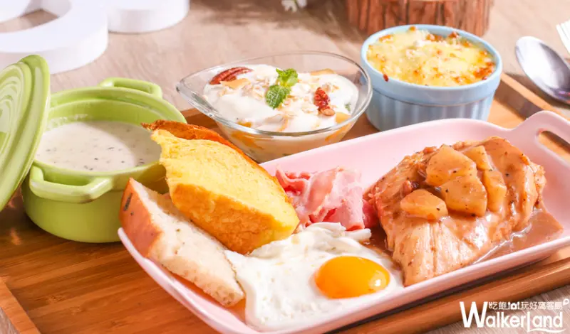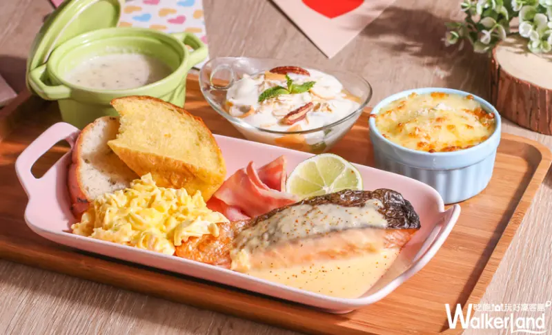 主餐有香草雞胸肉、檸檬鮭魚、蘑菇豬排等每份388元起的早餐套餐,內容有鄉村麵包、優格燕麥水果、牛奶洋芋起士、香煎培根等,大人小孩分食剛剛好,分量飽足又豐盛,並且提供無線暢飲的飲料自助吧,讓孩子們吃得健康有得玩,還有冷氣吹,成為周末假日避暑的新選擇。