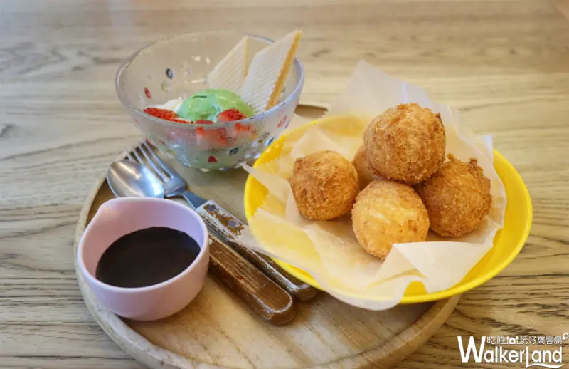 在甜品部份,與其他二分店截然不同的是北車店特別推出健康取向全新獨創的「豆腐甜甜球」甜點,甜甜球以非基改豆腐入料,融合糯米粉、麵粉、無鹽奶油、低糖製作而成,口感獨特,一口咬下原以為的Q彈卻是鬆軟、原以為的鹹香卻是微甜,口感細綿溫暖、麵香四溢,嚐過後似乎也喚起童年的某個記憶。豆腐甜甜球品項共有六款,以豆腐甜甜球分別搭配「綜合莓果 草莓冰」、「紅豆香蕉 抹茶冰」、「楓糖蜜腰果 香草冰」、「抹茶巧克力 抹茶冰」、「黑糖蜜黃豆粉 香草冰」、「芒果牛奶凍 芒果冰」的冰淇淋組合,不論餐後、午茶,為炎熱夏天帶來清涼甜蜜的消暑涼意。