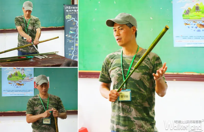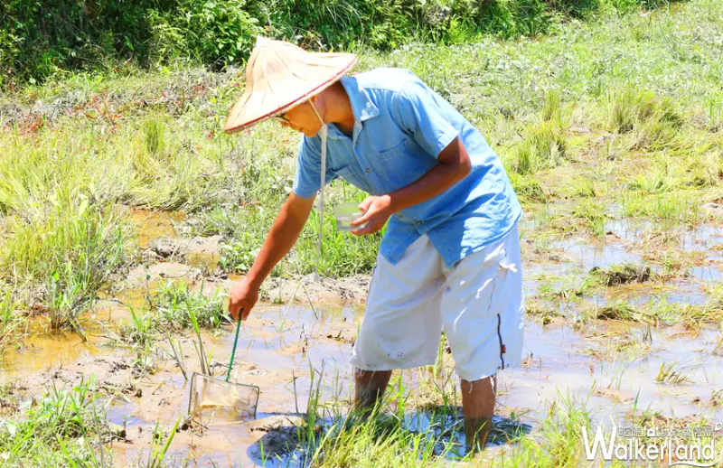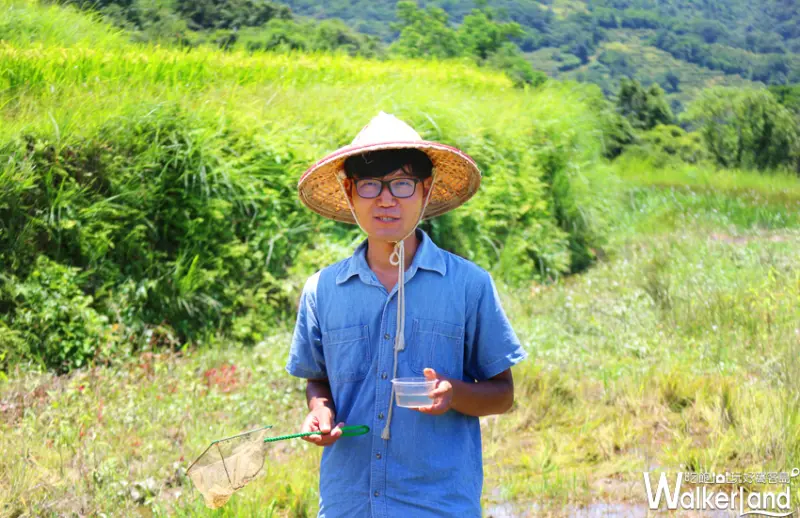 ▲劉恩豪示範如何在水梯田中,以簡單的器具就可以撈取到許多的昆蟲與動物。圖片:數位編輯林志豪攝影