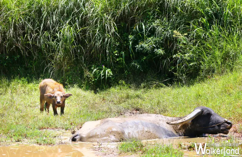 ▲水梯田一偶,耕牛躲進田間的水塘裡避暑。圖片:數位編輯林志豪攝影