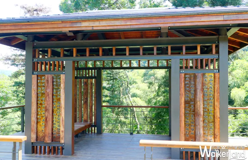 沿著茶園繼續前進,在豐潤的茶園小徑中,有一個充滿禪風的小涼亭靜靜的道路那頭等著遊客。在群山的環繞中,涼亭的牆面上呈現的是日治時前出生於梅山鄉的重要小說家-張文環的詩句,如「外面是成熟的稻穗照著陽光,發出金黃色的亮光,青蟬由於熱氣太 烈而忘我地鳴叫著。」張文環的詩句皆是信手捻來的梅山光影,遊客們藉由詩句可以感受到一種土地與人的自然互動。也許在這裡,遊客們可以喝個水、也許歇息、也許讀書,在涼亭的文藝風格下,拍出一張張充滿文青概念的照片。