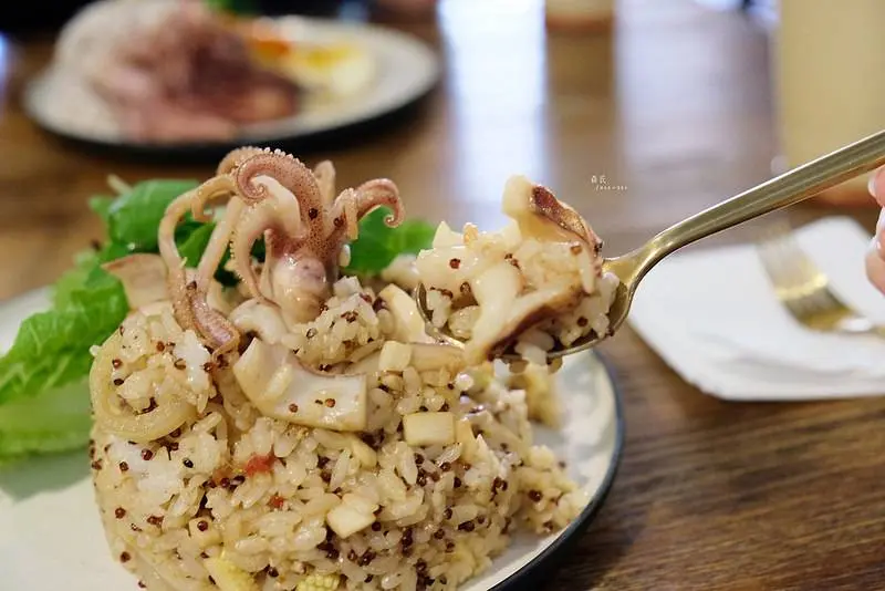 炊飯裡頭加入許多小卷切塊,每口都吃得到新鮮帶脆度的彈牙小卷、真材實料,混入健康的藜麥、洋蔥及玉米筍,入味帶紅酒醋的酸香。這道餐點深得我心,真的很美味呢!<全文介紹及店家資訊>