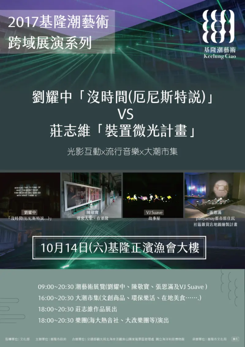 第三場動態藝術展演10月20日,來自巴西的VJ Suave藝術家,將有一場創作工作坊以及兩場投影巡遊,以投影設備與腳踏車將工作坊的創作投影在市區建築物上並與基隆知名的「慾望劇團」互動演出,此組藝術家先前參與台北市白晝之夜受到民眾的歡迎造成話題,這次來到基隆勢必成為基隆潮藝術的另一波高潮,創作工作坊與腳踏車巡遊名額有限,採預先報名。本年度基隆潮藝術邀請來自國內外的藝術家融合在地歷史、社會環境、全球議題等思考領域於作品中展現,海科觀周邊藝術品將展至11月30日;另基隆市政府邀請之作品於和平島公園以及正濱漁會大樓展至11月5日。基隆潮藝術亦包含表演藝術活動,11檔音樂、戲劇、舞蹈及國樂等各領域優質表演團隊,於基隆文化中心演藝廳及島嶼實驗劇場進一連串精彩的演出活動。有興趣參與各項活動可上基隆潮藝術官方網站http://keelungciao.com或基隆市政府文化局網站查詢http://www.klccab.gov.tw。![]()