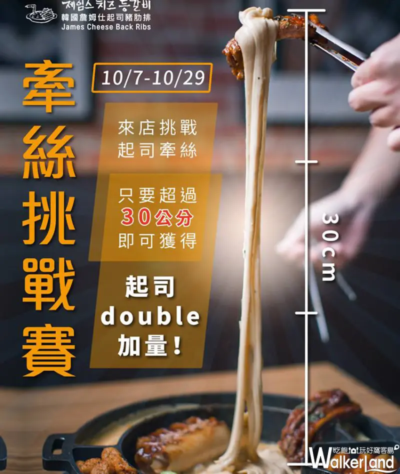 另外,詹姆仕起司豬肋排也在店內10/7~10/29舉辦「起司牽絲挑戰賽」,邀請大家來店挑戰將起司牽絲30公分,只要超過30公分,即可免費獲得「起司double加量」,是起司愛好者絕對不能錯過的好「食」機呀!
