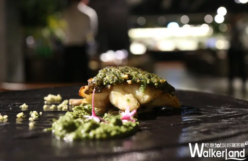 「堅果青醬龍虎斑」以歐式料理為主要料理法。為了襯托出龍虎斑的鮮甜與檸檬香氣,在醬汁選擇上以羅勒和堅果為主的青醬。另外,因為「鱻果魚三部曲」的肉質特性,本次主廚有別於以往的香煎手法,本次特別以源自法國的舒肥法(sous vide)來料理,在低溫、真空的狀態下,緩緩加熱龍虎斑,完整的保持住魚肉的組織與鮮甜檸檬香氣。