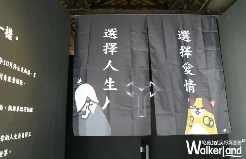 本次展覽的入口處就能感受滿滿的負能量,選擇愛情或選擇人生似乎是浪漫與現實的拔河,但觀眾若選擇了愛情,將有意想不到的結局;若選擇人生,就開始了滿滿的負能量衝擊。負能量版的「電流急急棒」想表達的是沒有人是負能量的絕緣體、教室的標語由禮義廉恥換成了「錢臉權爸」、上班族的苦悶在展覽中的「靠夢就飽有限公司」表露無遺。展覽中甚至還有一個拳擊場,讓觀眾可以在此宣洩生活中累積的負能量。正如同「每天來點負能量粉絲團」的版主林育聖所提出的概念:接受每天一點點的負能量,你會獲得負負得正的力量喔!![]()
