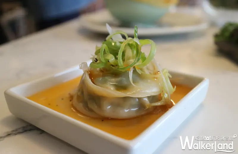 ▲「紅油皮蛋豆腐餃」,內餡為剁碎的皮蛋、豆腐與各式蔬菜,再淋上自製辣椒油及斜切青蔥,屬於市面少見的素紅油炒手。