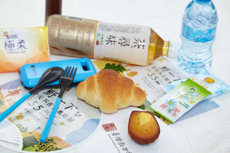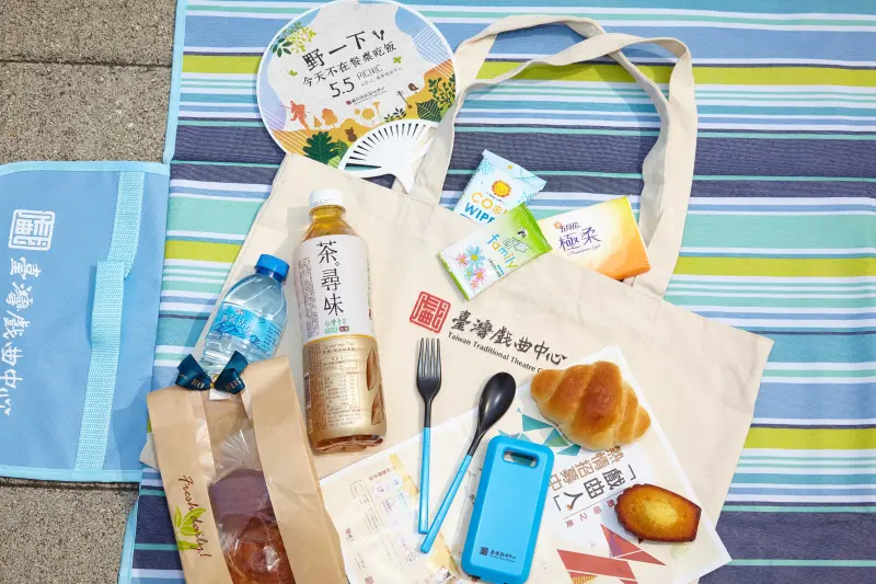 臺灣戲曲中心除了提供戶外廣場作為野餐場地之外,更貼心地為每一組報名來野餐的民眾,準備了野餐墊、環保提袋、鹹甜輕食、飲料、環保餐具組、隨身扇,甚至連濕紙巾及面紙都有呢!