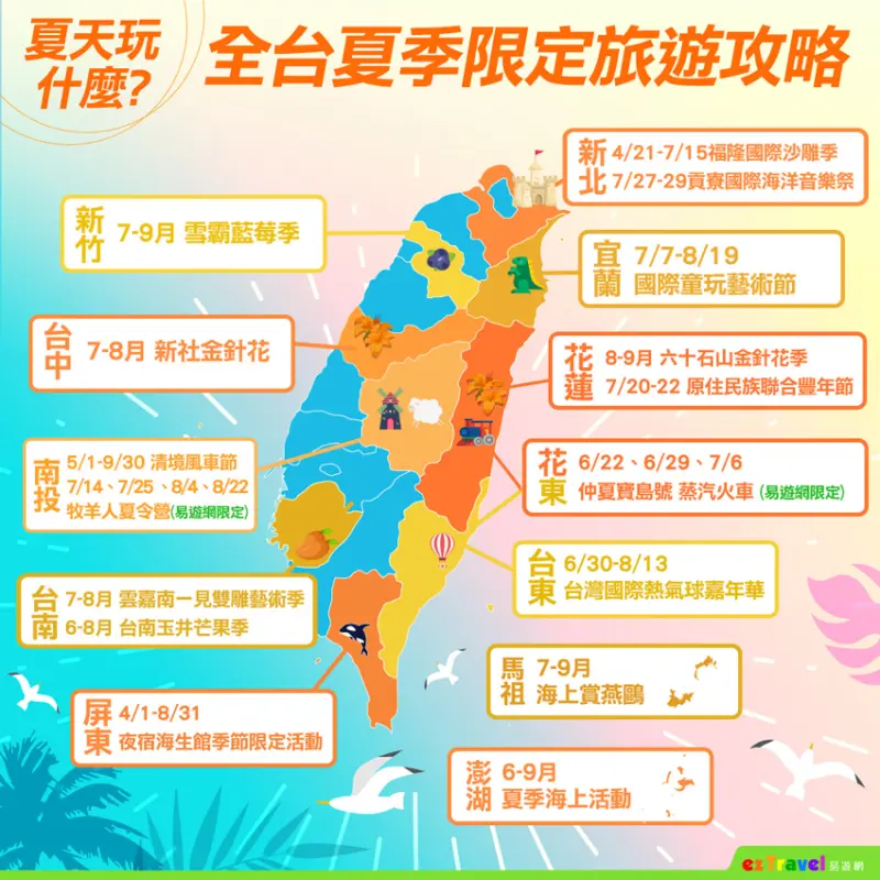 即將進入夏至,想在炎炎夏日出遊,掌握季節限定活動是首要撇步,易遊網整理出全台夏季限定旅遊攻略,並推出相關旅遊行程供大家參考選購,而接下來邁入暑假,想要來趟國內旅遊,就趕快來參考夏季活動進行規劃吧。![]()