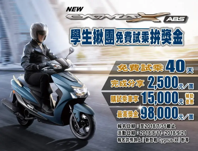 學生揪團免費試乘新勁戰ABS版40天,完成試乘分享15,000元購試乘車補助,每團還有最高98,000元獎金等你拿!