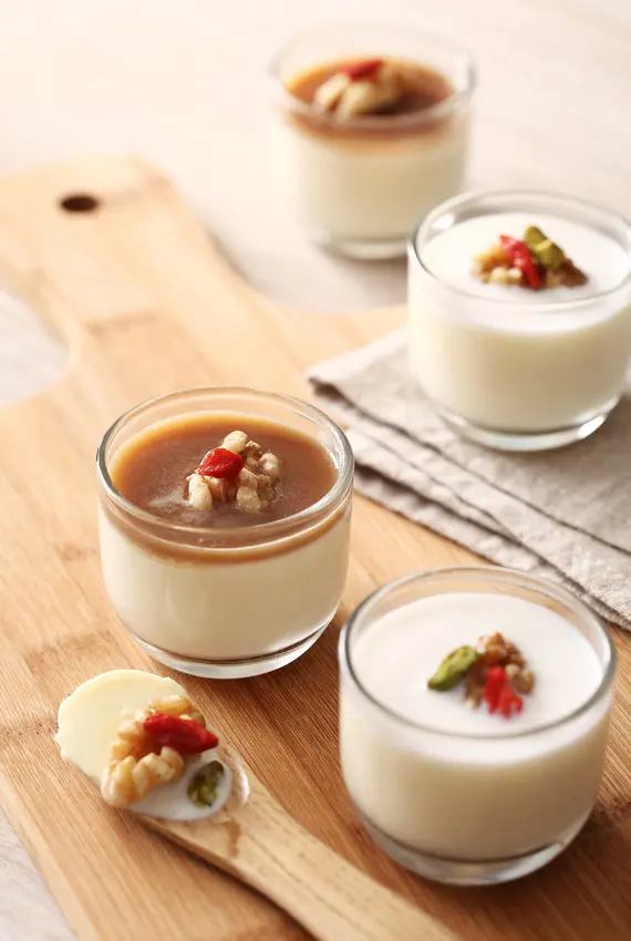 - 將羊奶與糖一起煮滾,轉小火後加入吉利丁,攪拌溶化後,再加入鮮奶油拌合,略微冷卻後,裝入容器內即可。