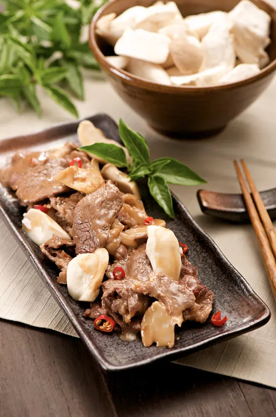 - 起油鍋,放入醃好的羊肉片,繼續加入杏鮑菇頭切片,以大火快炒至肉熟,即可上桌。