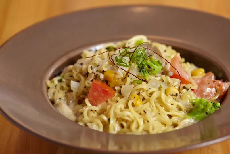 先將營多麵條川燙過一分鐘靜置,炒入野菇、番茄、玉米粒、花椰菜、洋蔥,再加入黑松露醬跟鮮奶油燉煮,最後再放入營多麵條略拌即可。