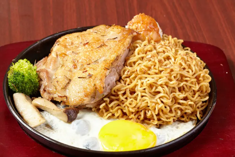 先將營多麵條川燙過一分鐘,再與特製醬汁拌炒,其後加入蔬菜,最後再放上美味的特製炸雞。![]()