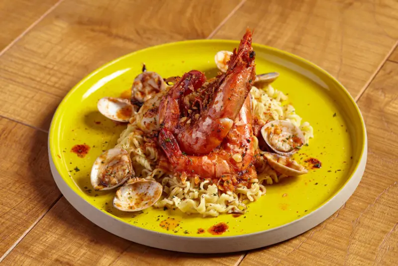 食材介紹:營多印尼炒麵、大蛤蜊、大草蝦、白肉魚片、小花枝、特製醬料