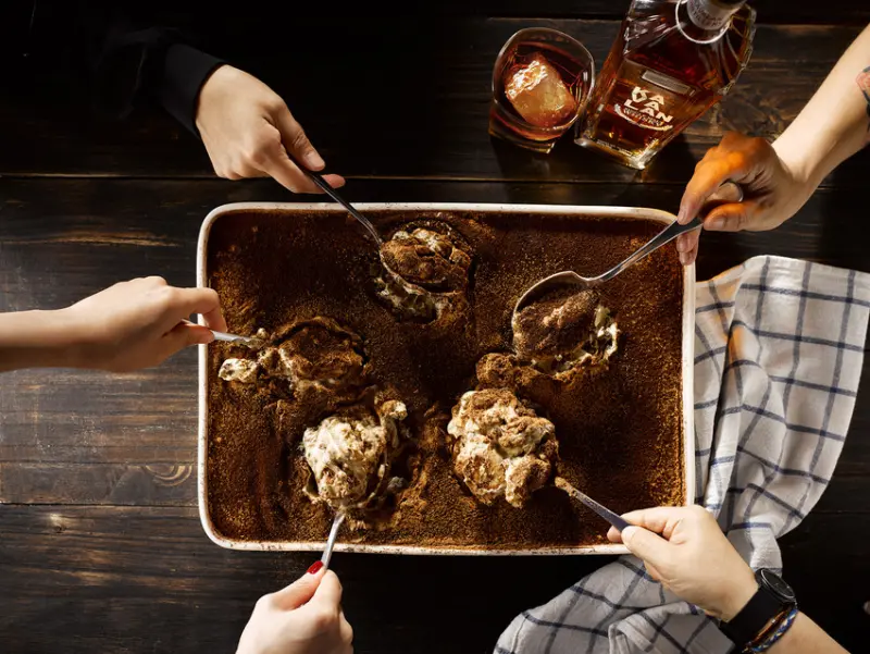 手指餅乾鋪底,淋上咖啡酒後並加入馬斯卡彭起司,再灑上泡過噶瑪蘭威士忌葡萄乾,再加入剩下馬斯卡彭起司,層層冷藏定型,最後撒上可可粉跟咖啡粉。帶有酒香的提拉米蘇,綿密柔軟,入口即化。