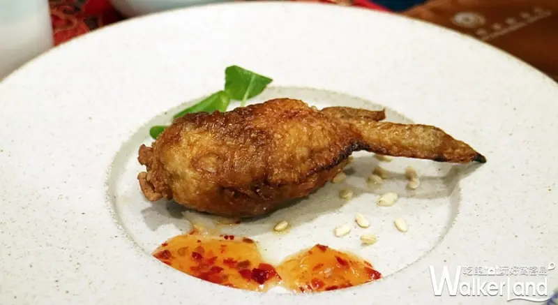 另一道費工的手工菜「糯米釀雞翅」,為港式料理之改良新菜,將雞翅去骨後,塞入翻炒過後的糯米飯,再進行油炸;雞翅去骨時需留意不能皮破,且為讓雞翅表皮呈現酥脆口感,須先泡醋再予以風乾、油炸,才能呈現出一隻隻金黃油亮的雞翅。