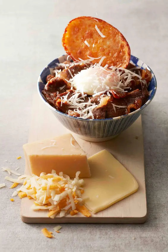 起司瀑布燒肉丼,將莫札瑞拉與切達起司製成起司餅,和滿滿的現刨起司層層堆疊,譜出幸福的起司三重奏。