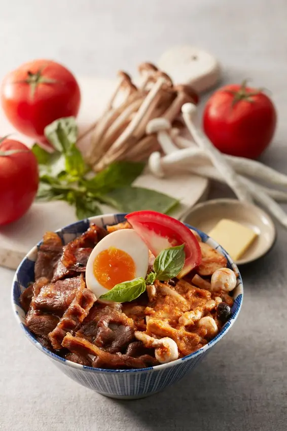 紅醬起源於義大利,以蕃茄為基底搭配各式香料調製成各地區口味,西西里紅醬燒肉丼,嚴選新鮮蔬果熬製義式紅醬與精靈菇、鮑魚菇、杏鮑菇拌炒增加口感,佐以奶油提升丼飯香氣,適合全家大小!