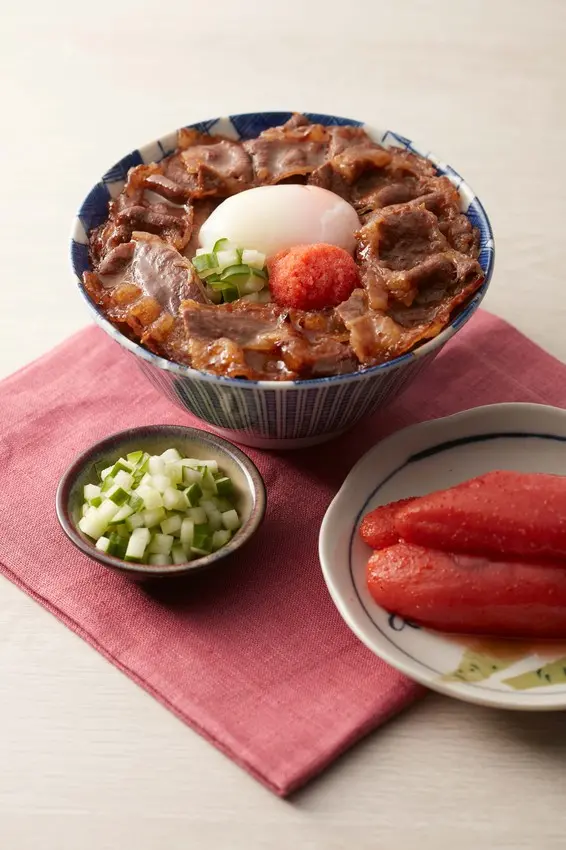 明太子燒肉丼,日本福岡地區名產明太子,將鱈魚卵以辣椒粉調和,紅澄澄的明太子讓人胃口大開,小黃瓜中和了明太子的鹹味,推薦給喜歡清爽口味的丼粉。